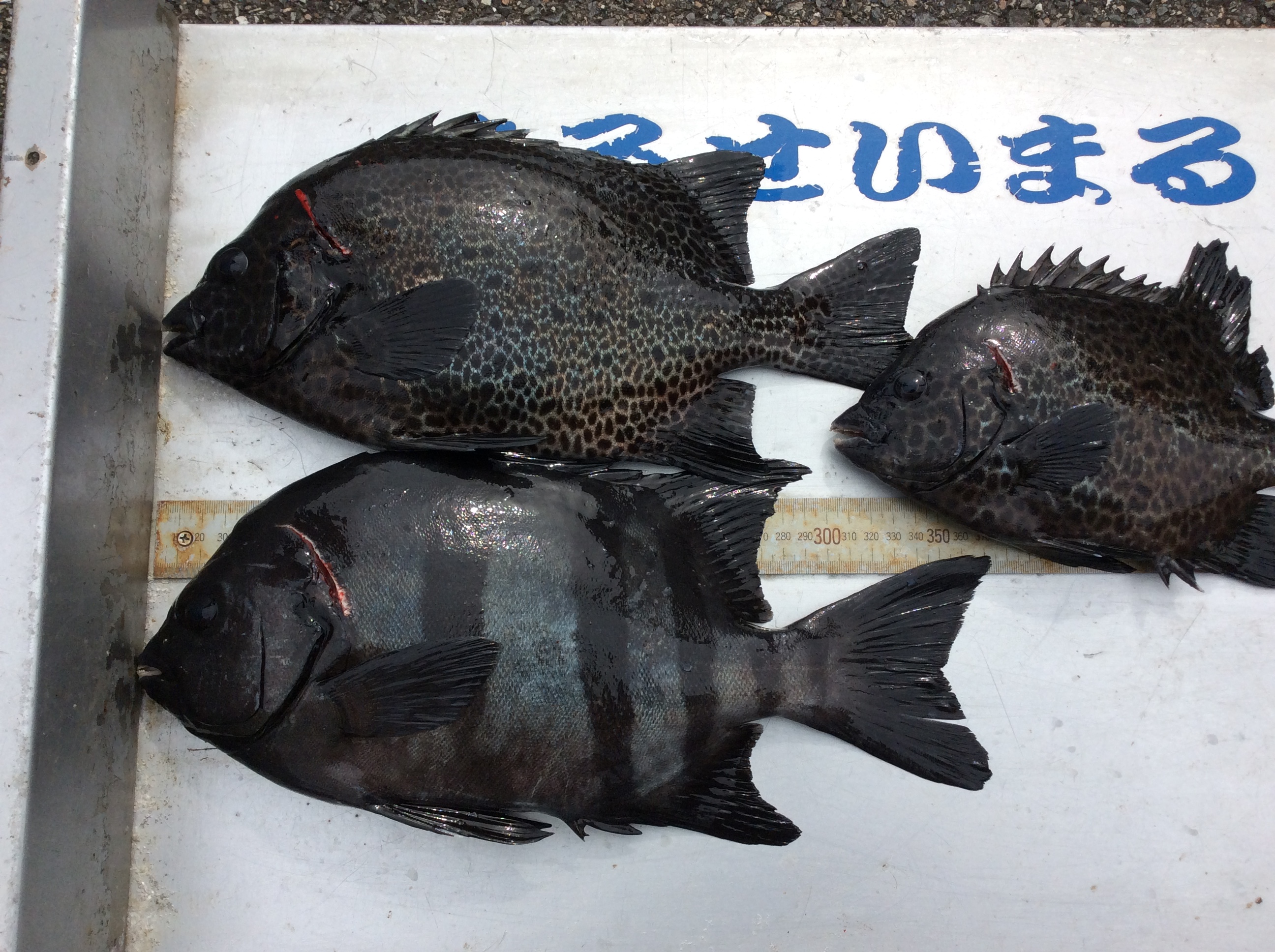 | | イシガキ 30p〜32p 2匹 アカハタ 28p 1匹 カワハギ 28p 1匹 | 釣 人 :那智勝浦町 塩崎 宏樹さん エ サ : ウニ 釣 方 : 底物釣り | |