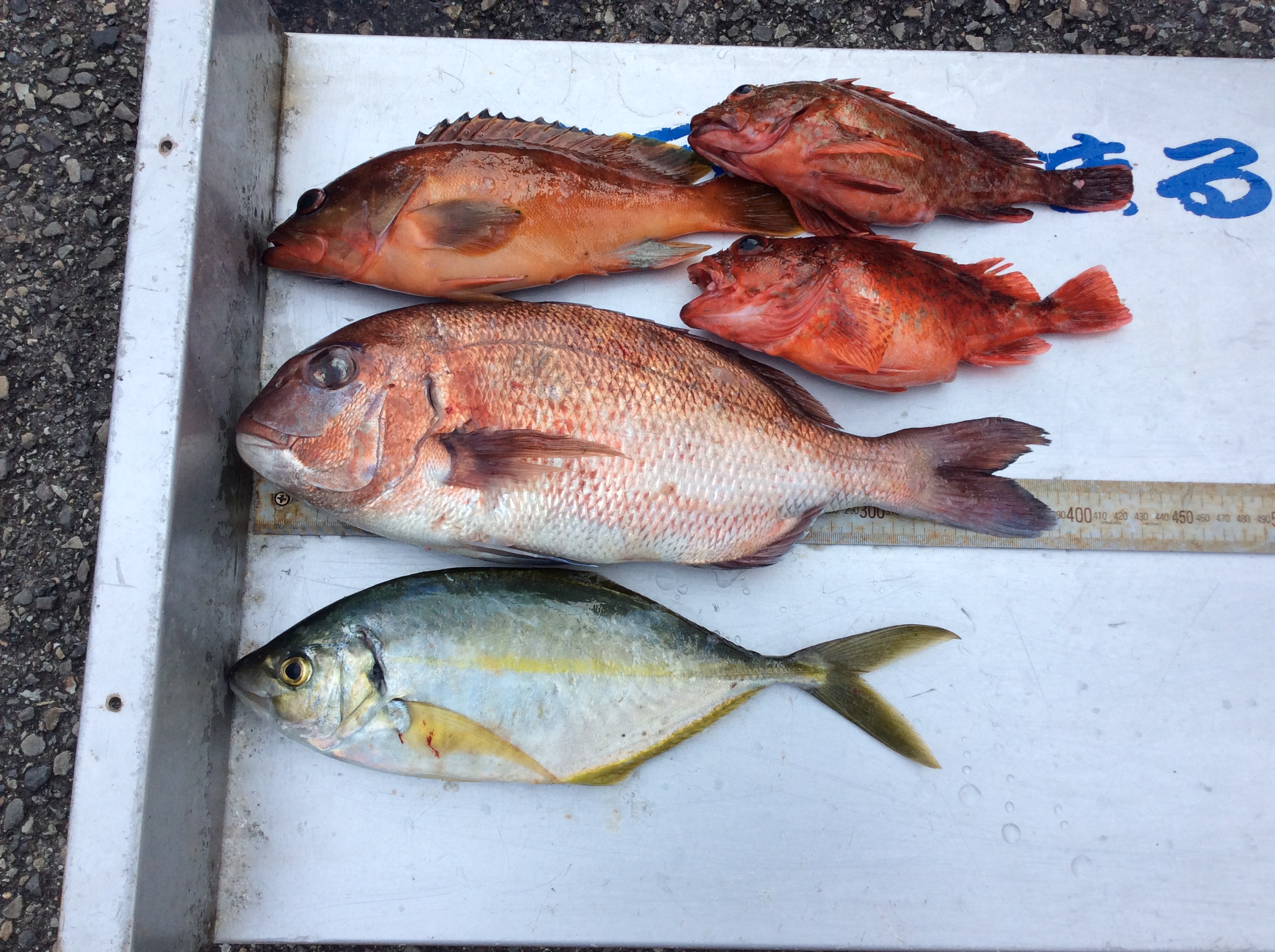 | | マダイ 39p 1匹シマアジ 34p 1匹アカハタ 28p 1匹 | 釣 人 :羽曳野市 染矢 清隆さん エ サ : オキアミ 釣 方 : かご釣り | |