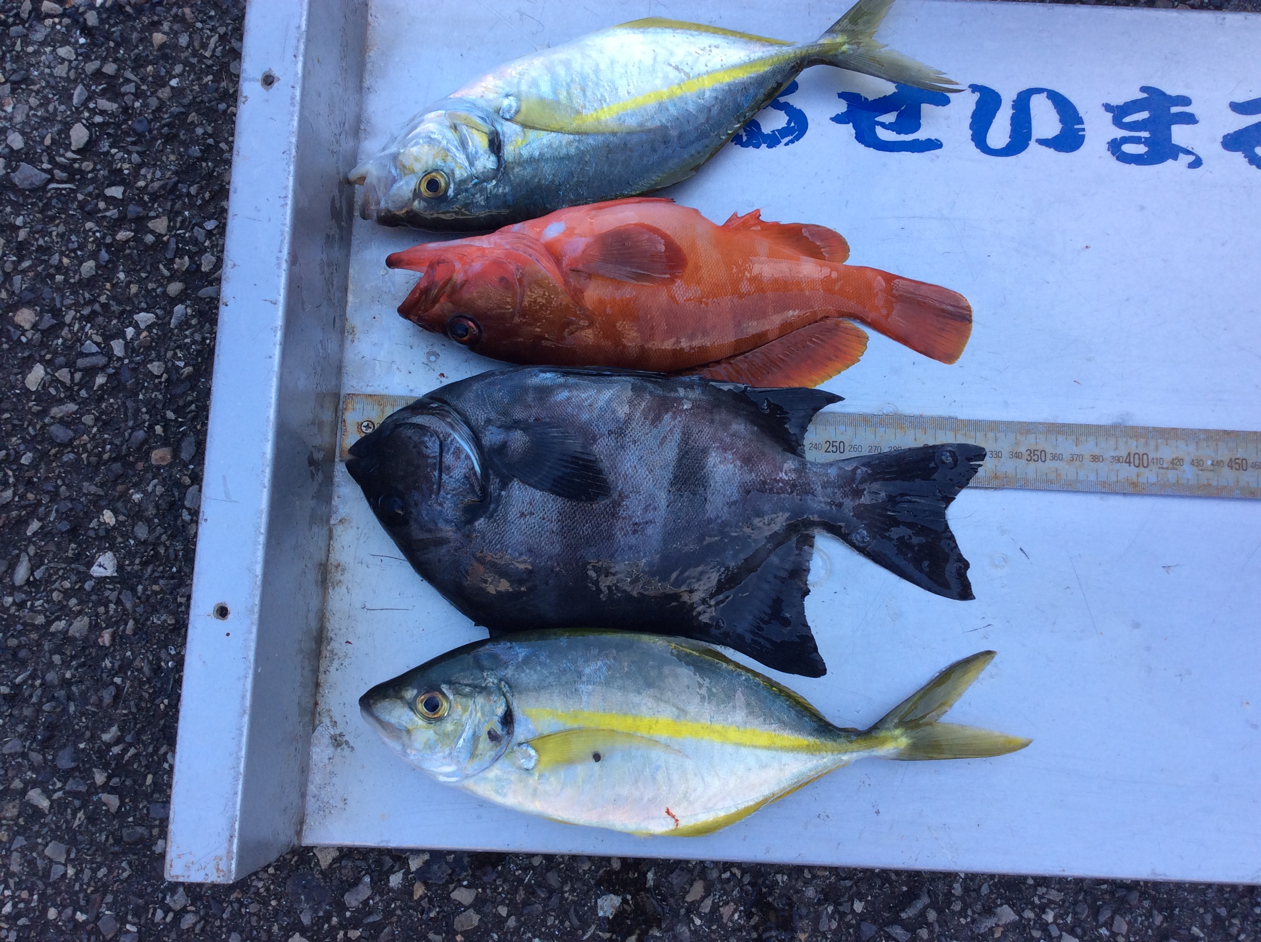 | | シマアジ 30p〜32p 2匹 アカハタ 30p 1匹三羽層33p 1匹 | 釣 人 :西宮市 山下 豊昭さん エ サ : オキアミ 釣 方 : フカセ釣り | |