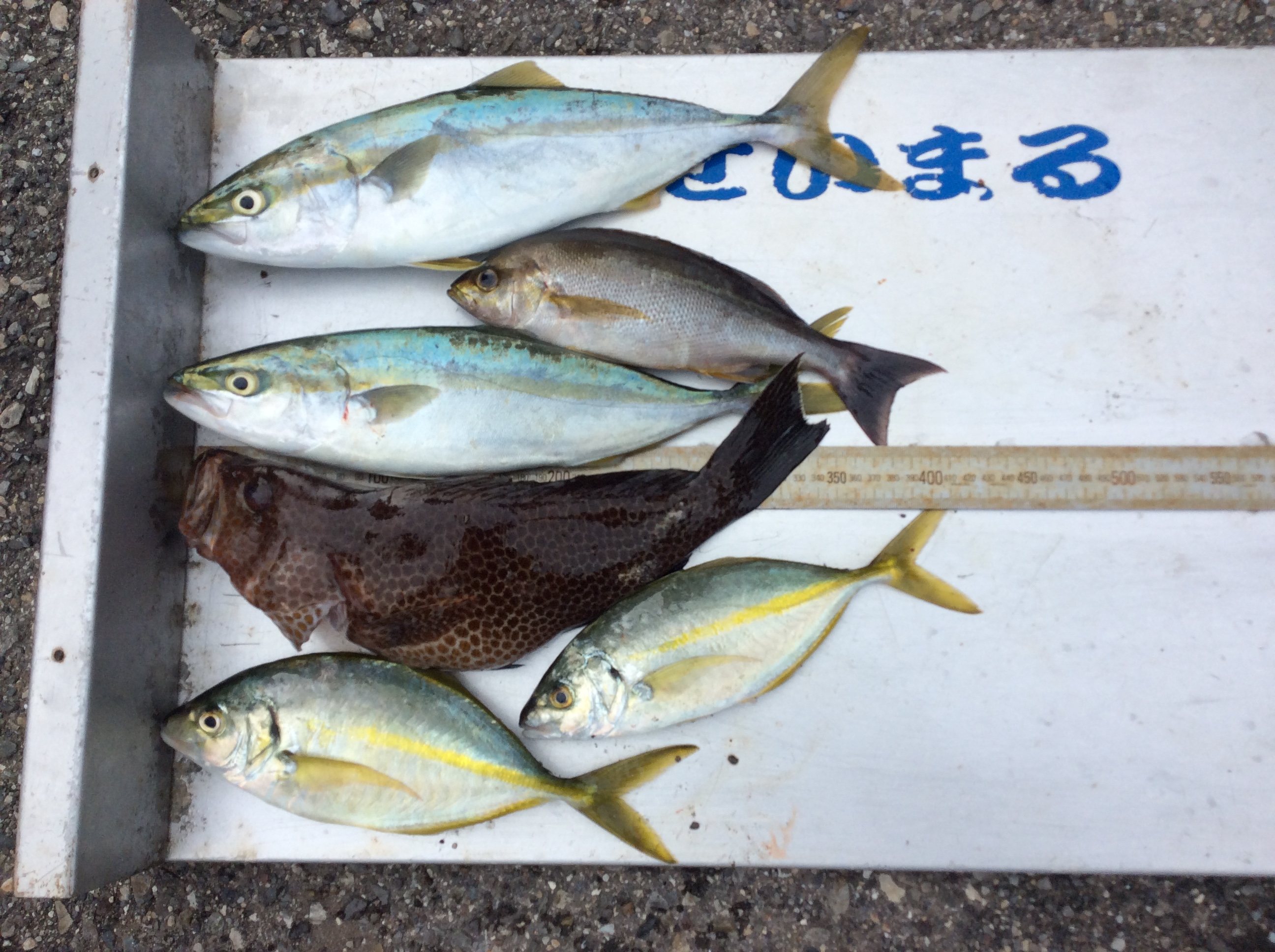 | | ツ゚バス 35p〜37p 2匹シマアジ 20p〜25p 2匹オオモン 37p 1匹 イサギ 35p 1匹 | 釣 人 :堺市 小川 典彦さん エ サ : オキアミ 釣 方 : かご釣り | |