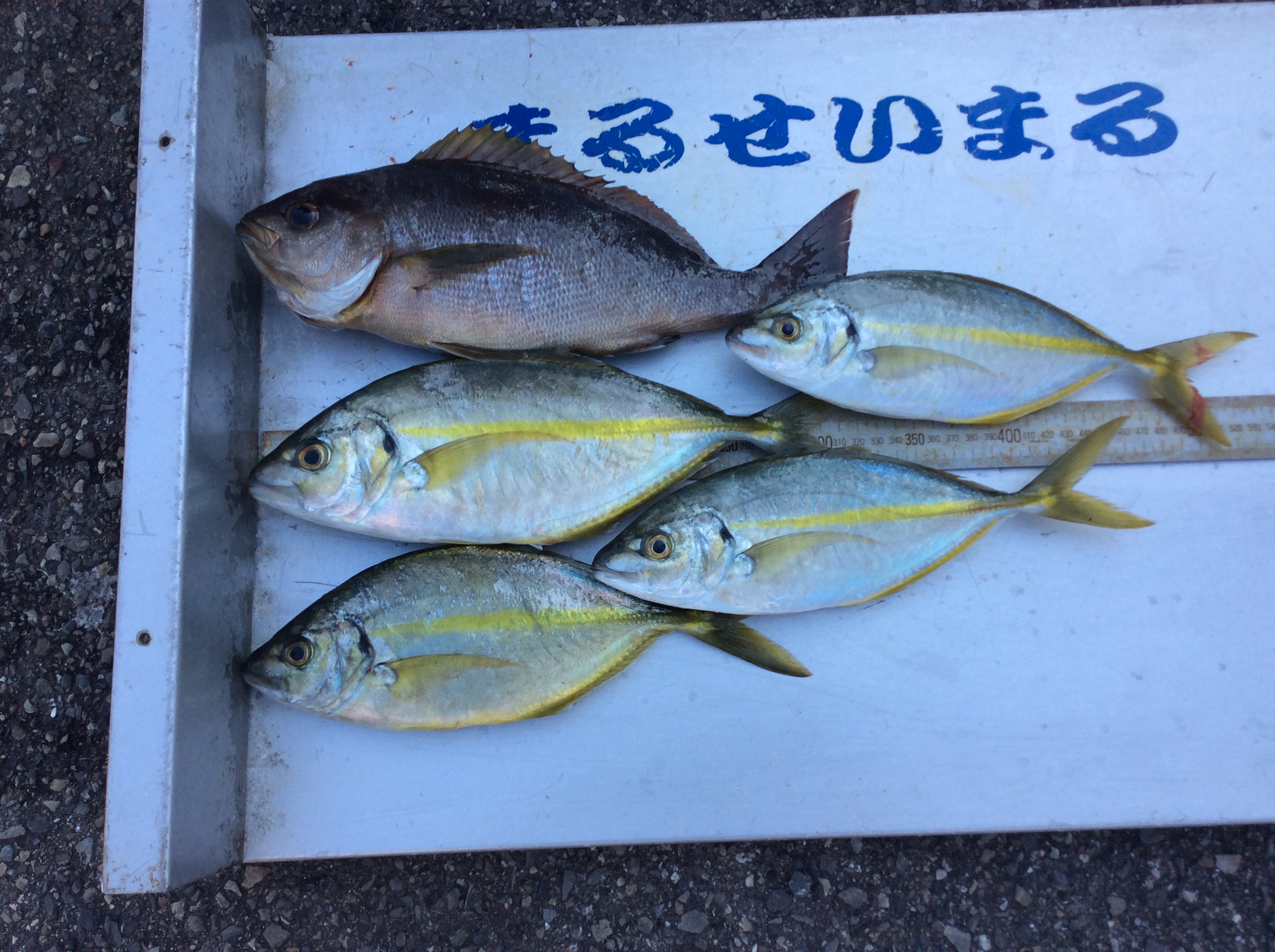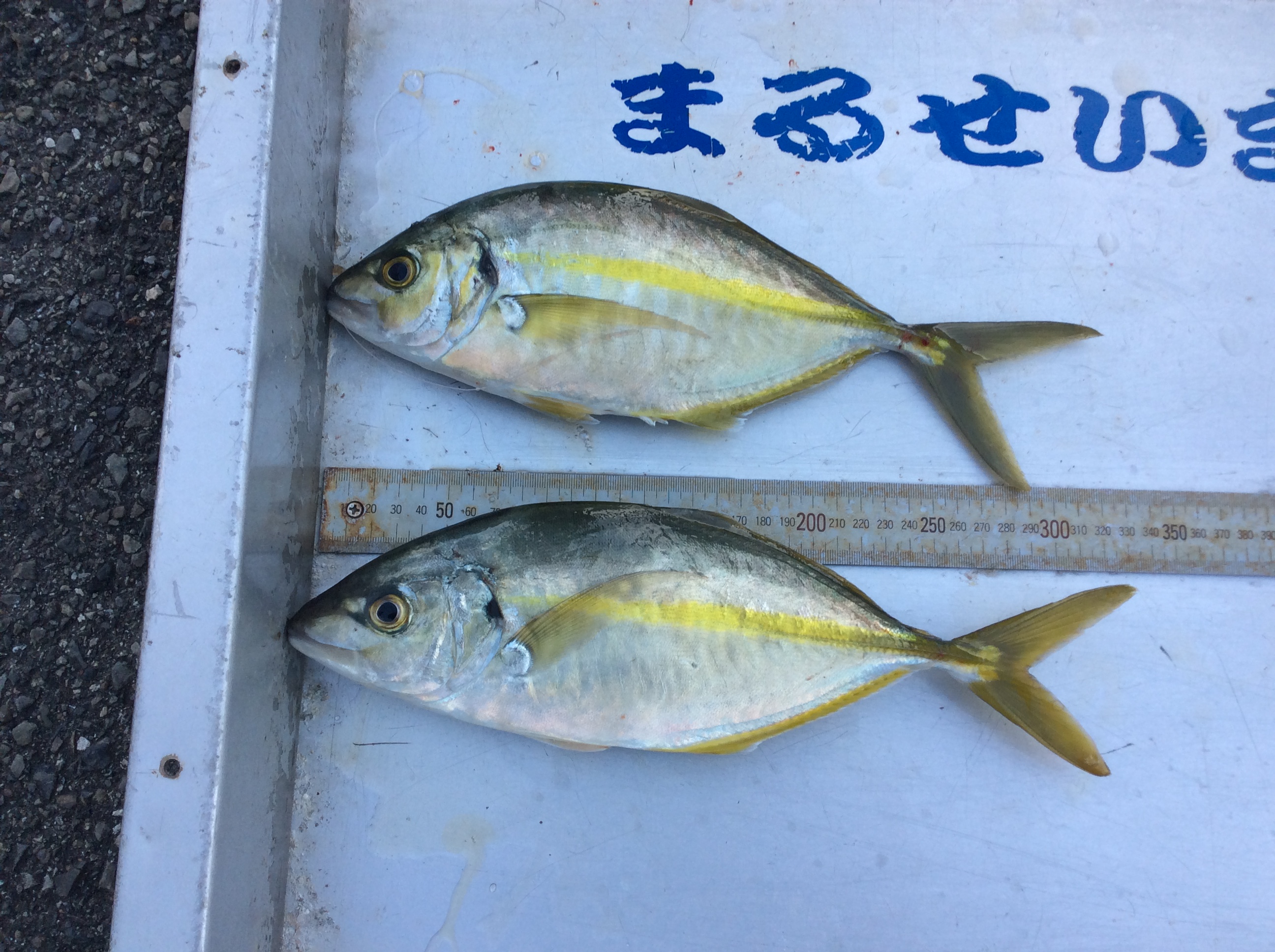| | シマアジ 32p〜34p 2匹 | 釣 人 :豊田市 宮嶋 澄さん エ サ : オキアミ 釣 方 : かご釣り | |