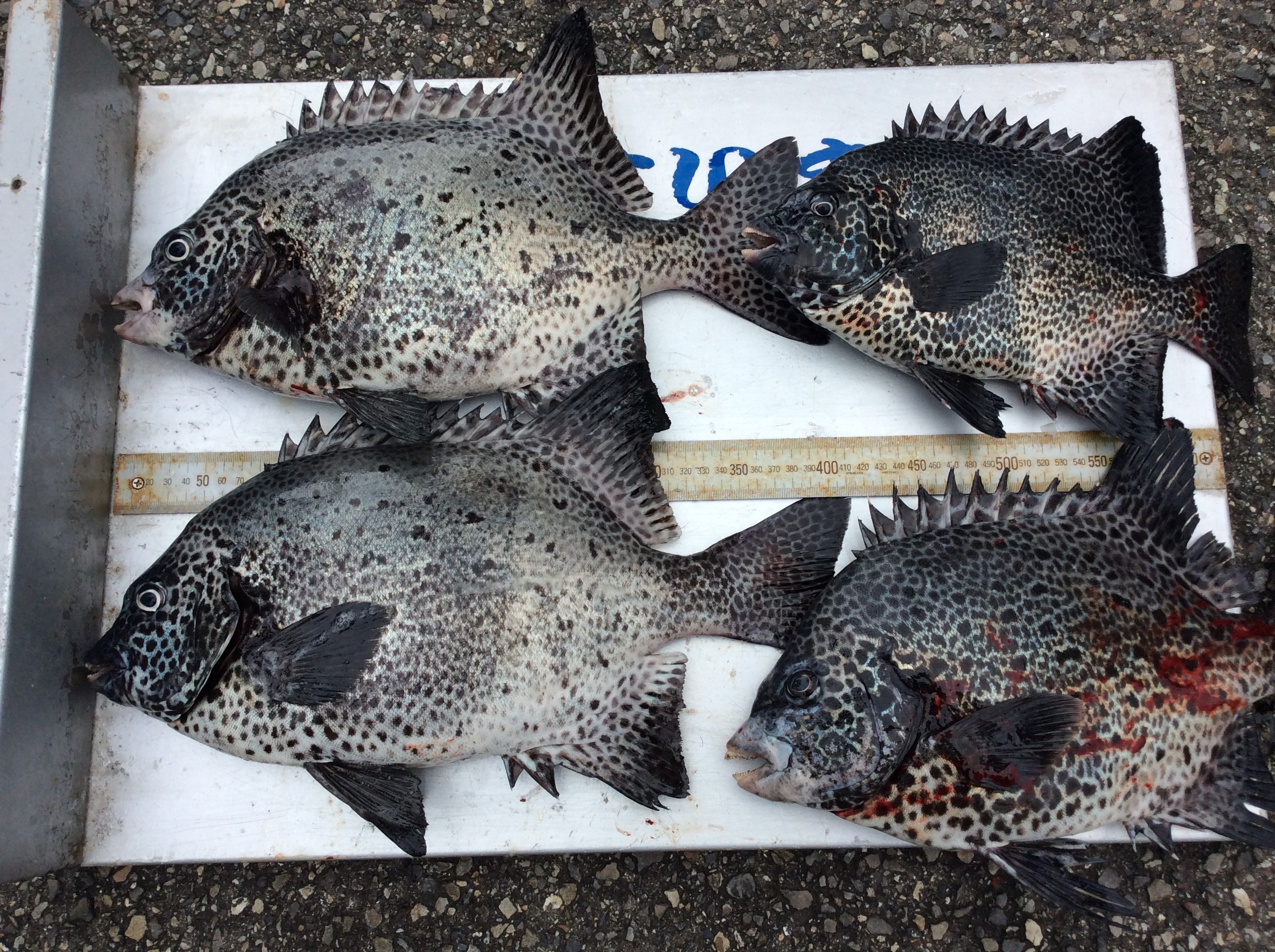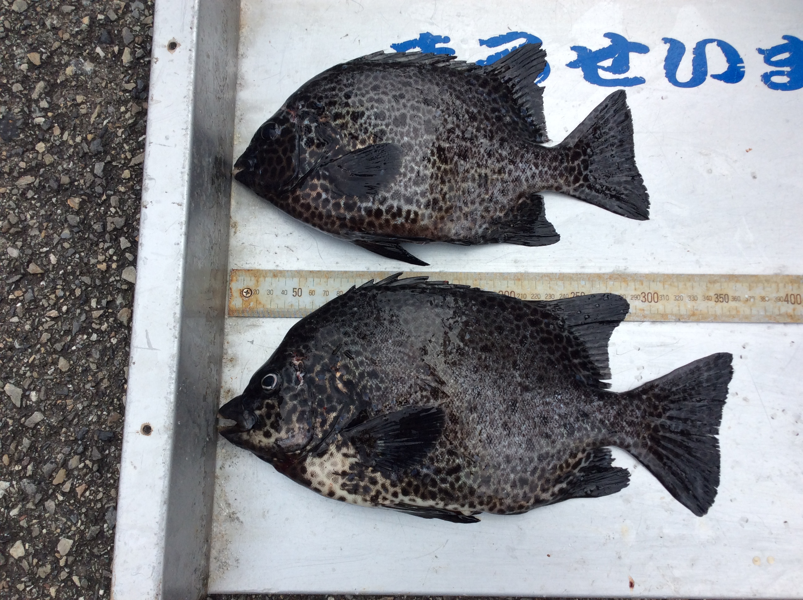 | | イシガキ 30p〜36p 2匹 | 釣 人 :那智勝浦町 塩崎 宏樹さん エ サ : ウニ 釣 方 : 底物釣り | |