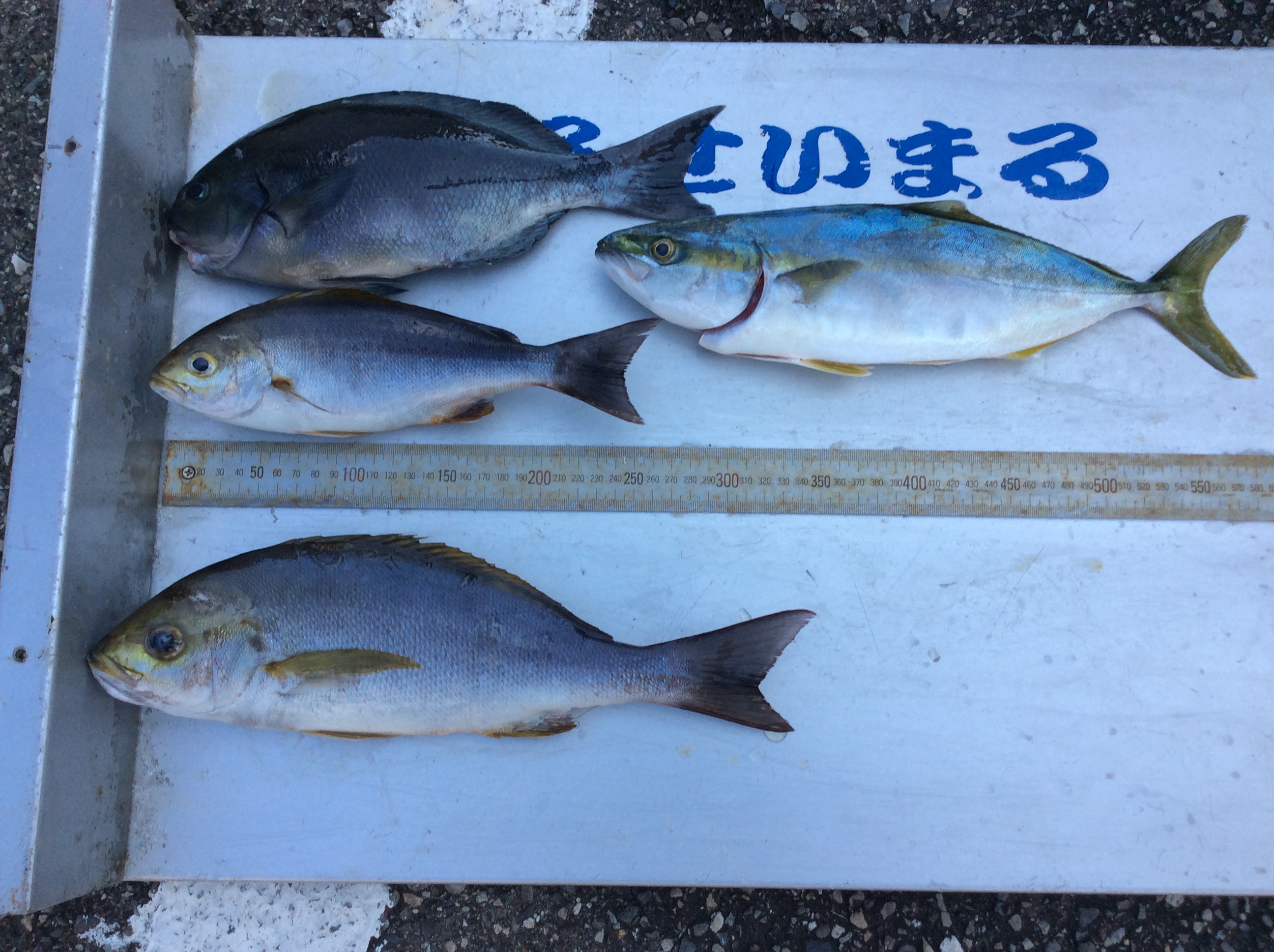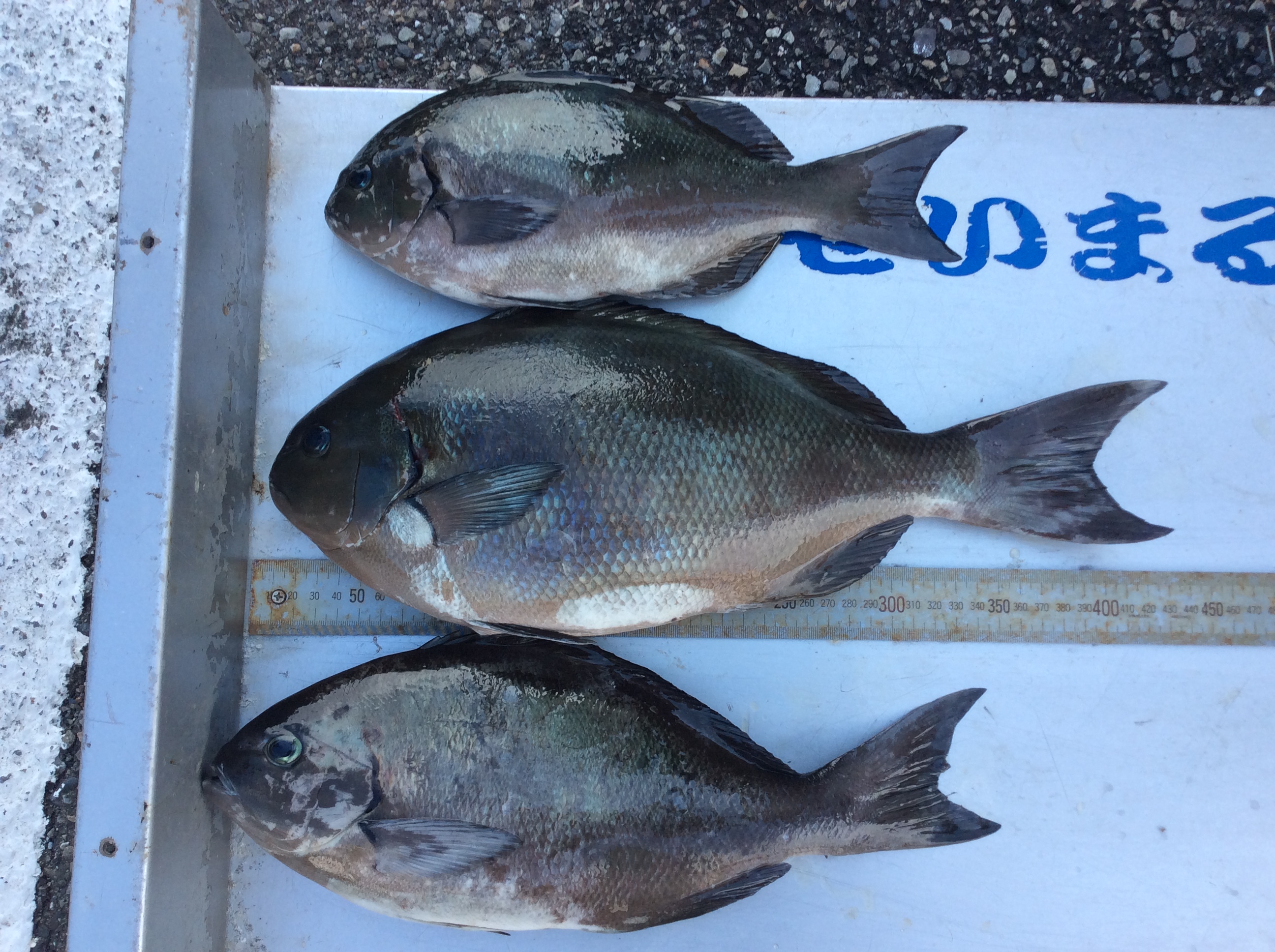 | | グレ 30p〜41p 3匹 | 釣 人 : 羽曳野市 染矢 清隆さん エ サ : オキアミ 釣 方 : かご釣り | |