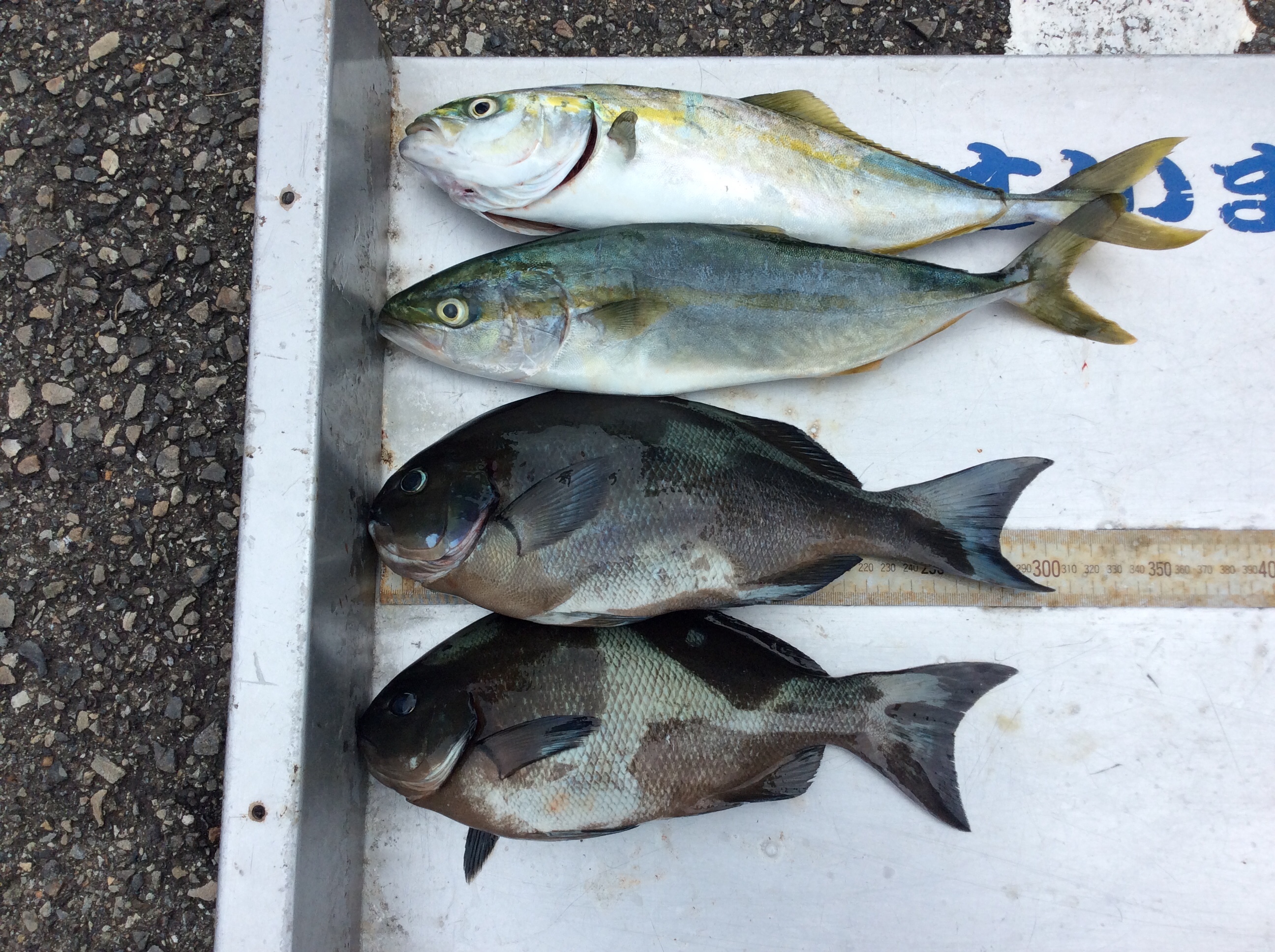 | | イサギ 28p〜33p 2匹 グレ 30p 1匹ツ゚バス 38p 1匹 | 釣 人 :鈴鹿市 船附 淳志さん エ サ : オキアミ 釣 方 : かご釣り | |